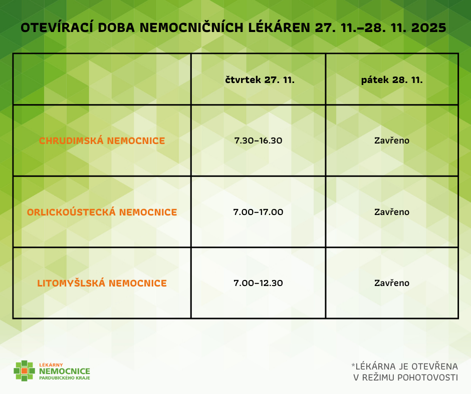 Z důvodu pravidelné inventury dojde ve čtvrtek 27. a pátek 28. listopadu 2025 k omezením provozu tři z pěti lékáren Nemocnice Pardubického kraje.