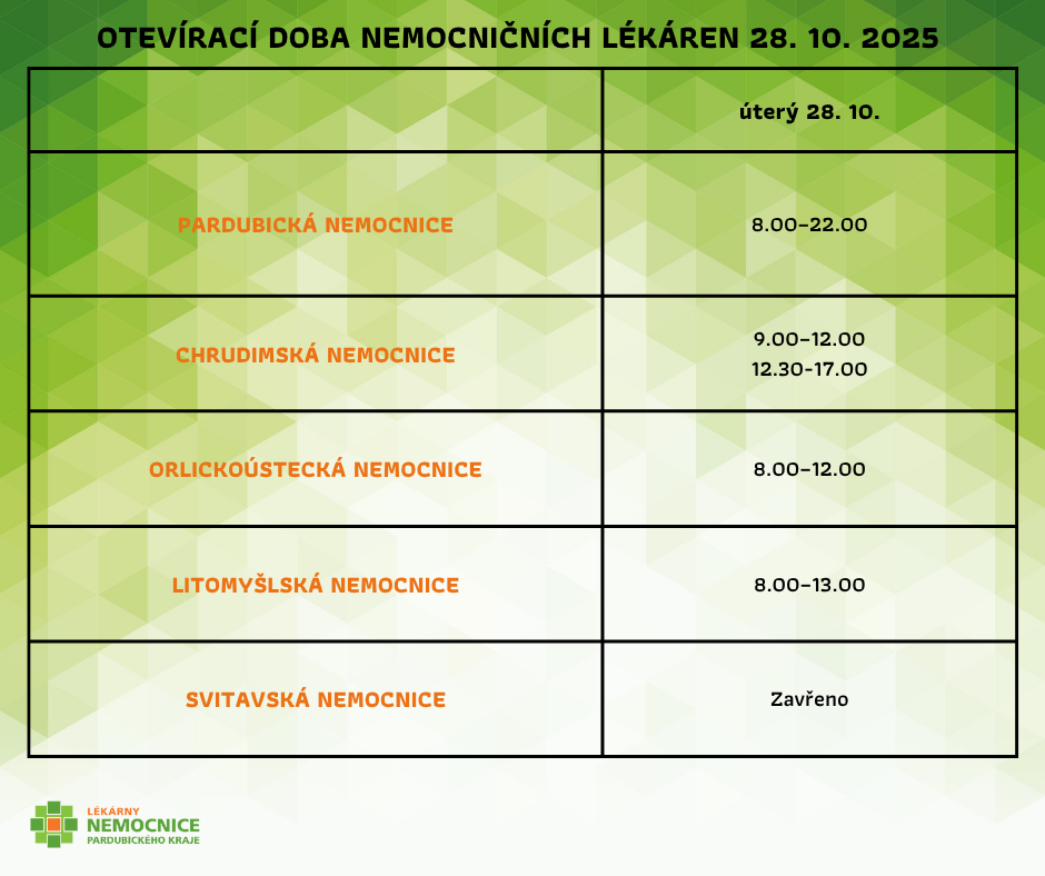 V tabulce níže naleznete provozní dobu našich nemocničních lékáren o nadcházejícím svátku 28. října 2025.