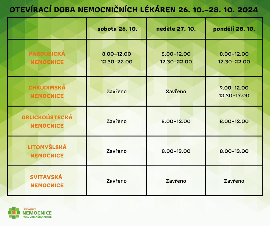 Během následujícího víkendu a na státní svátek budou mít lékárny Nemocnice Pardubického kraje upravenou otevírací dobu viz obrázek níže.