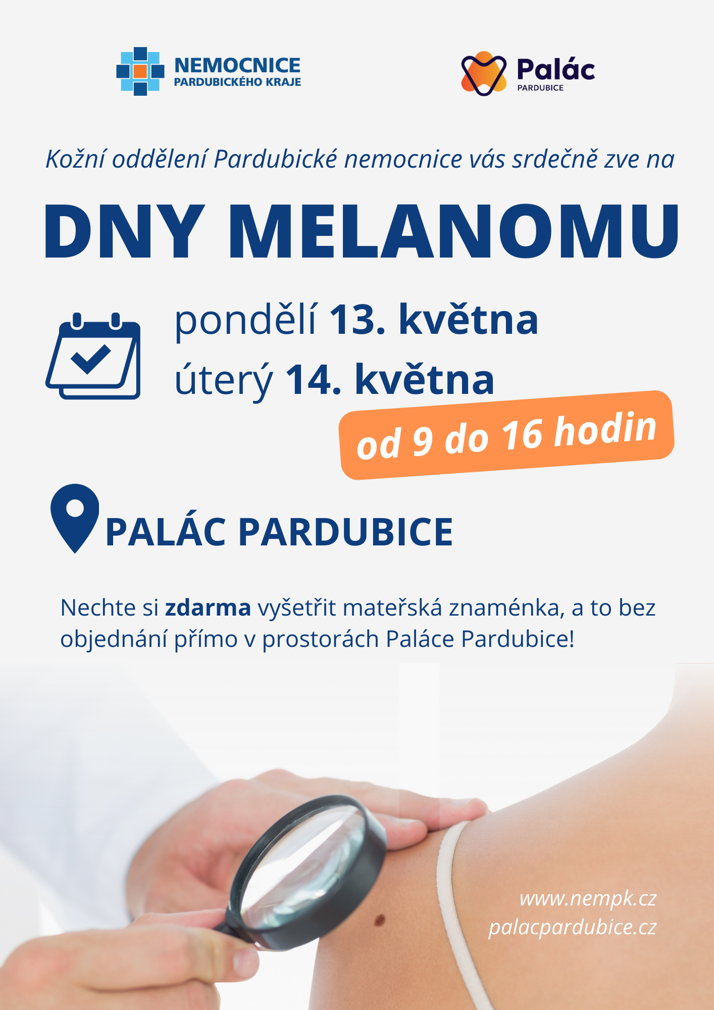Kožní oddělení Pardubické nemocnice se i letos připojuje k osvětové akci Evropský den melanomu. Při této příležitosti nabízí možnost nechat si zdarma vyšetřit mateřská znaménka, a to bez objednání přímo v prostorách Paláce Pardubice. Dny melanomu se zde uskuteční v pondělí 13. a v úterý 14. května 2024, vždy od 9 do 16 hodin. Touto cestou se každoročně snaží upozornit veřejnost na nebezpečí rakoviny kůže a vyzdvihnout důležitost samovyšetření, pravidelných preventivních prohlídek a upozornit na rizika nadměrného opalování.